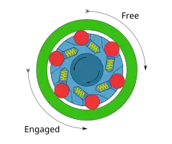 Pokud se bude vnější prstenec (na obrázku znázorněn zeleně) točit ve směru hodinových ručiček (směr Free) budou se kuličky (případně válečky, jehličky) tlačit do širšího místa (proti pružinám). Zde budou mít dostatek místa, aby se mohly volně odvalovat. Volnoběžka se bude protáčet – točivý moment se nebude přenášet z vnější do vnitřní (znázorněna modře) části.