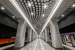 Co se podoby nástupiště týče, jejím nejvýraznějším prvkem je strop. Strop na nástupišti je zavěšený, jedná se o parametrickou konstrukci složité geometrie a je vyroben z identických maloformátových hliníkových prvků umístěných v různých výškách. Bodová svítidla jsou zabudována do stropní konstrukce. Stropní železobetonové konstrukce jsou natřeny tmavě šedou barvou, což vyvolává kontrast se zavěšeným stropem. Podhledový systém spolu s lampami v něm umístěnými vytváří souvislé proudění, které má představovat Mléčnou dráhu. Dvě řady sloupů složitého tvaru jsou vyrobeny z betonu a natřeny silikátovou antivandalovou směsí, která zachovává texturu betonu. Složitá struktura stropu kontrastuje s jednoduchým vzorem podlahy, která byla pokryta žulou ve dvou odstínech - bílým a tmavě šedým.