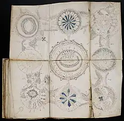 • Botanická část. Ilustrace obsahují obrázky běžně vypadajících evropských rostlin. Většina z nich je ale identifikovatelná jen obtížně, některé dodnes nebyly identifikovány.