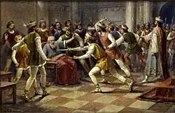 Snad na 3000 členů rodu Vršovců bylo povražděno roku 1108 na příkaz knížete Svatopluka poté, co byl po Svatoplukově návratu z Uher Mutina označen za zrádce.[4] Český kronikář Kosmas ve své kronice popisuje scénu, jež se odehrála 28. října roku 1108 na pražském tržišti a jíž byl očitým svědkem: