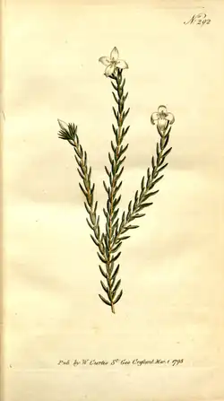 - ↑ BREDENKAMP, C.L. A monograph of the genus Passerina (Thymelaeaceae). Ph.D. thesis.. [s.l.]: University of Pretoria, 2002. (anglicky)