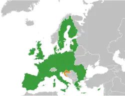 1. července 2013 Chorvatsko vstoupilo do Evropské unie.[25] Toto datum stanovila Evropská komise dne 10. června 2011. Oficiální oslavy vstupu Chorvatska do EU se konaly dne 30. června 2013 na Náměstí bána Jelačiće v Záhřebu za přítomnosti José Manuela Barrosa a dalších představitelů Evropské unie.