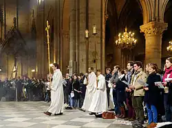 Zatímco se zpívá vstupní zpěv, přicházejí duchovní s ostatními přisluhujícími ze sakristie nebo jiného vhodného místa do presbytáře v tomto pořadí: