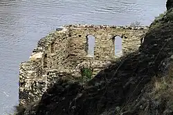 Vyšehradská skála. Zřícenina nad tunelem je tzv. Libušina lázeň, zbytek strážní bašty ze 14. století. Bývala tam stará vyšehradská vodárna, která je u bašty sv. Ludmily[1]