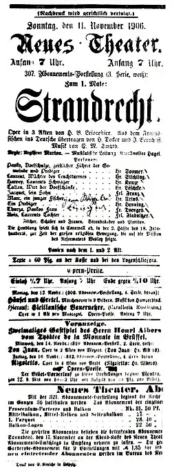 - ↑ Smyth, Ethel: ... Sonntag, den 11. November 1906. Neues Theater ... Strandrecht. Oper in 3 Akten von H. B. Lesorestier. Aus dem Französischen ins Deutsche übertragen von H. Decker und J. Bernhoff. Musik von E. M. Smyth ... [online]. München: Bayerische Staatsbibliothek [cit. 2021-04-13]. Dostupné online. (německy)
