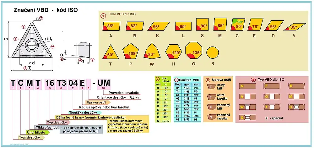 VBD pro obrábění kovů, přesněji řečeno pro soustružení a frézování, se vyrábějí ve tvarech normalizovaných normou ISO. Tyto destičky mají shodný systém označování, jenom destičky pro frézování s fazetkou na špičce mají místo rozměru radiusu kód značící úhly fazetek.