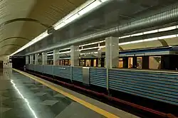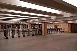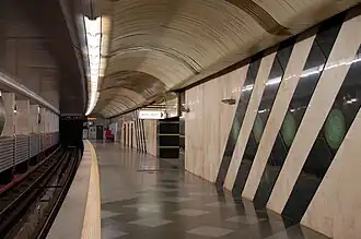 ![]() ![]() ![]() Horní obrázek je pohled na zeď stanice s diagonálními vložekami ze zeleného mramoru, smaltu a mozaikovým vzorem uprostřed Dolní obrázek vlevo je pohled na pás který rozděluje koleje Dolní obrázek vpravo je pohled na vestibul stanice s turnikety | |||||||||||||||||||||||||||||||||||||||||||||||||||||||||||||||||||||||||||||||||||||||||||||||||||||||