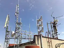 Stožár s vysílacími anténami bývá umístěný i na mrakodrapu,[9] například na Empire State Building v USA nebo Burj Khalifa ve Spojených arabských emirátech. Menší a méně nápadné než radiotelevizní vysílače jsou anténní systémy vysílačů pro ostatní telekomunikační služby. Jsou to zejména základnové stanice buňkové sítě pro mobilní telefony BTS,[10] umístěné v terénu na samostatných stožárech nebo na rozhlednách a vysokých budovách. Podobné jsou i anténní systémy vysílačů dalších mikrovlnných spojů, používané pro nejrůznější účely (datové sítě, internet atd.). Mezi vysílače patří i všechny radiostanice (vysílačky) PMR, CB, radioamatérské, vojenské a další.