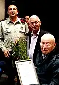 Udělení děkovného certifikátu vůbec druhému veliteli Vysoké školy národní bezpečnosti El'adu Peledovi na konferenci absolventů, leden 2020. Zleva doprava: velitel školy Itaj Veruv, Efrajim Lapid a El'ad Peled.