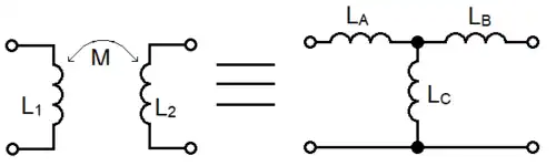 Pokud jsou cívky od sebe galvanicky odděleny a ovlivňují se pouze magnetickými poli, hovoříme o transformátorové vazbě. Takovéto uspořádání dvou cívek lze nahradit ekvivalentním obvodem ze tří cívek, z nichž jedna reprezentuje vzájemnou indukčnost. Tento model je platný, pokud:[ 2]