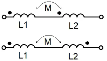 {\displaystyle u_{1}=L_{1}{\frac {\mathrm {d} i_{1}}{\mathrm {d} t}}\pm M{\frac {\mathrm {d} i_{2}}{\mathrm {d} t}},}