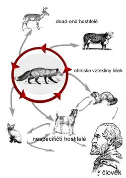 - ↑ COLLINGE, Sharon K.; RAY, Chris. Disease Ecology: Community structure and pathogen dynamics. New York: Oxford University Press, 2006. 227 s. Dostupné online. ISBN 978-0-19-856708-0. Kapitola Spatial-temporal dynamics of rabies in ecological communities, s. 175. (anglicky)