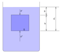 Horní podstava nechť se nachází v hloubce . Na tuto podstavu působí podle tlaková síla , která směřuje dolů. Spodní podstava se nachází v hloubce . Tlaková síla, která působí na spodní podstavu, je a směřuje svisle vzhůru.