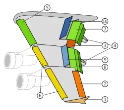 - odklápěcí náběžná hrana – Krügerova klapka (5) (anglicky Kruger flap) – dolní část náběžné hrany, která se odklápí směrem dopředu.