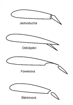 - jednoduchá klapka na odtokové hraně (anglicky Plain flap) – taková, která se jen sklápí a nevytváří štěrbinu; tvoří ji celá zadní část křídla.