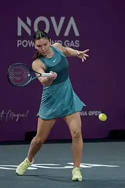 Simona Halepová (* 27. září 1991 Constanța, Rumunsko), profesionálka od roku 2006, ve dvouhře žebříčku WTA nejvýše postavená na 1. místě v říjnu 2017, jako první rumunská žena na vrcholu klasifikace, a ve čtyřhře na 71. místě během května téhož roku. Na okruhu WTA Tour vyhrála dvacet čtyři singlových turnajů a s Beguovou Shenzhen Open 2018 ve čtyřhře. V rámci grandslamu triumfovala na French Open 2018 a ve Wimbledonu 2019. První tři grandslamová finále prohrála, na French Open 2014 a 2017 i Australian Open 2018. Do semifinále postoupila na US Open 2015. Ve dvou obdobích strávila na čele klasifikace 64 týdnů. Sezóny 2017 a 2018 završila jako konečná světová jednička. Mezi lednem 2014 a červencem 2021 figurovala v první světové desítce 373 týdnů bez přerušení, což ji při konci kariéry řadilo na 8. místo historických statistik. Jako první od Grafové v roce 1986 vybojovala prvních šest singlových trofejí v jedné sezóně. V říjnu 2022 byla dočasně suspendována po pozitivním testu na roxadustat během US Open 2022. V květnu 2023 byly zjištěny nesrovnalosti v jejím biologickém pasu. Nezávislý tribunál v září 2023 potvrdil obě pochybení a uložil jí trest zákazu činnosti na dobu čtyř let od jejího suspendování, do roku 2026. V březnu 2024 uspěla s odvoláním u Mezinárodní sportovní arbitráže, která jí snížila trest na devět měsíců, s uplynutím předmětné doby v červenci 2023. Na okruzích tak absentovala mezi zářijovým US Open 2022 a březnovým Miami Open 2024. Profesionální dráhu završila na únorovém Transylvania Open 2025 v Kluži,[23][24] k danému datu jako třetí nejvýdělečnější tenistka historie za Serenou a Venus Williamsovými, se ziskem 40,2 milionů dolarů.[25]