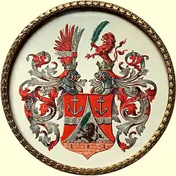 V červeném štítu má stříbrný klín, v něm z hradby s cimbuřím zobrazen rostoucí heraldicky vpravo obrácený červený dvouocasý lev s palmovou ratolestí v pravé tlapě, v horní polovině štítu dvě plovoucí železné kotvy.