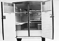 Sanitní vůz vystavený na pražském autosalonu v roce 1931 měl odpérovány i závěsy nosítek. Vyhovoval dle komentáře všem požadavkům pohodlně dopravy raněných i na velké vzdálenosti.[3] Byl původně určen pro přepravu 2 osob (dvoulůžkový). Od roku 1932 byl nabízen s přepravním prostorem se čtyřmi lůžky, se speciálními odpérovanými závěsy a odděleným místem pro lékaře včetně nezbytného vybavení (skříňka s léky a nástroji pro první pomoc). Cena byla stanovena na 55 000 Kč (1935).