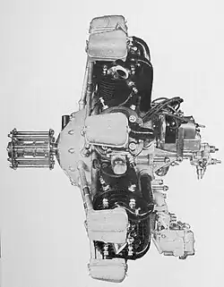Dvoudílná kliková skříň motoru byla odlita z hliníkové slitiny. Válce byly z ocelových výkovků, na které byla nalita hliníková chladicí žebra. Hlava válce z hliníkové slitiny měla střechovitý kompresní prostor, byla přitažena k válci čtyřmi šrouby a utěsněna byla metaloplastickým těsněním. V dvouventilové hlavě (sací a výfukový ventil na každý válec) se ventily pohybovaly v bronzových vodících pouzdrech. Bronzová sedla ventilů byla za tepla nalisována a zaválcována. Pohyb ventilů byl odvozen od vačkového kotouče se třemi řadami vaček. Vačkový kotouč byl uložen v přední části motorové skříně. Vačky působily na páčky, ty pak na zdvihátka a prostřednictvím zdvihacích tyčinek a vahadélek, čímž byly řízeny ventily. Mechanismus vahadel a zpruh byl uzavřen do dvojdílného krytu, zdvihací tyčinky v dvoudílných trubkovitých pouzdrech.[8]