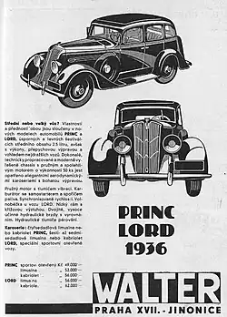 V roce 1934 byla limuzína Lord nabízena za 75 000 Kč,[16] od té doby cena pouze klesala. Pro sezónu 1935, což byl poslední rok, kdy se továrna Walter zúčastnila pražského autosalónu, byl uzavřená šestisedadlová "limousina" Lord nabízen za 59 tisíc Kč, kabriolet s patentním skládáním nepromokavé střechy, se synchronizací a volnoběhem stál 68 tisíc Kč.[7] To byly ceny srovnatelné třeba se šestiválci Praga Alfa nebo Škoda Superb.[5] Pro rok 1936 byly ještě sníženy na 56 tis. Kč u limuzíny a na 62 tis. Kč u kabrioletu.[17]