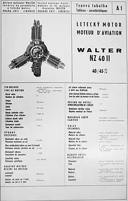 - ↑ Popis leteckého motoru Walter NZ 40 (příloha I. k protokolu o homologaci). I. vyd. Praha: Ministerstvo veřejných prací, 1930. 2 s. S. 1–2.