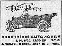 - ↑ Walter – prvotřídní automobily. Národní listy. 1914-06-07, roč. 54. (1914), čís. 154, s. 6. Dostupné online.