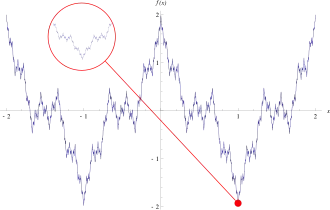 Funkce se chová jako fraktál, neboť zvětšené části grafu a původní graf jsou podobné.[1]