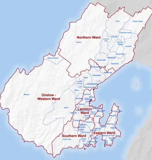 - Okrsky: Brooklyn, Aro Valley, Kelburn, Mount Victoria, Oriental Bay, Te Aro, Thorndon, Wadestown, Highbury, Pipitea, Roseneath