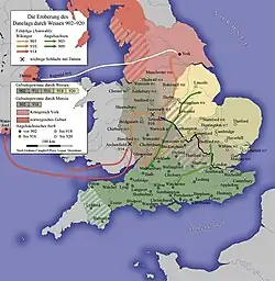 Po vikingské invazi z roku 890 byly Wessex a část Mercie opakovaně napadány vikingy usídlenými v Anglii. Alfrédův syn a následník Eduard I. Starší převedl Londýn, Oxford a jejich okolí ze správy Mercie pod Wessex. V letech 913 až 918 série útoků vypudila vikingy z Mercie a Východní Anglie a území na jih od řeky Humber se dostalo pod Eduardovu kontrolu. Roku 918 Eduard převzal správu Mercie, a tak byl položen základ vzniku jednotného království. Eduardův následník Æthelstan dobyl Northumbrii a získal tak poprvé kontrolu nad celým územím Anglie a transformoval Wessex na Anglické království.