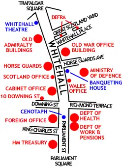 Vládní budovy ve Whitehallu (ze severu na jih):