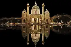 - Karlskirche: (Kostel svatého Karla) slavný barokní kostel s kopulí a dvěma sloupy v průčelí