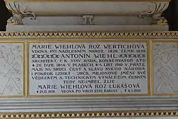 C. K. STAVEBNÍ RADA ARCHITEKT / ANTONÍN WIEHL / A JEHO MANŽELKA / MARIE WIEHLOVÁ / ROD. LUKÁŠOVÁ / VĚNOVALI TENTO DŮM / I OSTATNÍ SVÉ JMĚNÍ / ČESKÉ AKADEMII CÍSAŘE / FRANTIŠKA JOSEFA PRO VĚDY / SLOVESNOST A UMĚNÍ, / ABY Z NĚHO ZALOŽEN BYL / FOND ARCHITEKTA / ANT. WIEHLA A MANŽELKY / JEHO MARIE K POVZBUZOVÁNÍ / VĚDECKÝCH OBJEVŮ / A TECHNICKÝCH VYNÁLEZŮ.Pamětní deska Wiehlova domu[36]