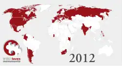 V roce 2012 se soutěž Wiki Loves Monuments rozšířila i za hranice Evropy, zařazeno bylo 35 až 36 zemí či regionů z několika kontinentů.[1] Zapojily se země a regiony z několika kontinentů, například z Evropy Španělsko, Andorra společně s Katalánskem, Francie, Itálie, Švýcarsko, Lichtenštejnsko, Lucembursko, Belgie, Nizozemsko, Dánsko, Švédsko, Norsko, Estonsko, Německo, Rakousko, Rumunsko, Srbsko, Česká republika, Slovensko, Polsko, Bělorusko, Ukrajina, Rusko (novými evropskými účastníky tedy byly Itálie, Srbsko, Česká republika, Slovensko, Bělorusko a Ukrajina, přestalo se účastnit Portugalsko a Maďarsko), z Ameriky nově Kanada, Spojené státy, Mexiko, Panama, Kolumbie, Argentina a Chile, z Afriky nově Jižní Afrika, Keňa a Ghana, z asijské oblasti kromě Ruska nově též Indie, Izrael a Filipíny. Slovensko se k soutěži připojilo opožděně, izraelská soutěž měla posunutý termín na období od 14. září do 15. října.