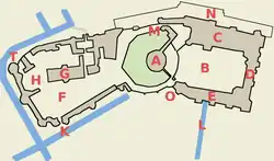 Jednotlivé části hradu jsou na plánku označeny písmeny. Do hradu vedou dvě brány: brána krále Jindřicha VIII. (hlavní vchod v plánku označený písmenem K) a Normanská brána (M).