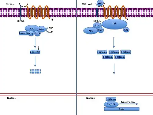 Princip fungování kanonické Wnt dráhy (také známé jako Wnt/β-kateninová dráha) je, že β-katenin, který byl střádán v cytoplazmě, se přesune do jádra, kde má roli jako transkripční koaktivátor transkripčních faktorů, jež patří do rodiny TCF/LEF (T buněčný faktor/lymfoidní spouštěcí faktor). Bez proteinu Wnt by se β-katenin v cytoplazmě neakumuloval, protože by byl degradován destrukčním komplexem, který obsahuje následujícií části: Axin, nádorový supresor APC (adenomatous polyposis coli), proteinovou fosfatázu 2A (PP2A), kinázu glykogensyntázy-3 (GSK3) a kaseinovů kinázu (CK1α).[15][16] Degradace β-kateninu probíhá tak, že jej degradační komplex označí pro ubikivitinaci a následně se β-katenin dostane do proteazomu, kde je rozložen.[12][17] Jakmile se však Wnt naváže na Fzd a LRP5/6, činnost degradačního komplexu je narušena, a to kvůli tomu, že negativní regulátor dráhy Wnt Axin, a tedy i destrukční komplex, jsou translokovány do plazmatické membrány. Axin je fosforylován jinými proteiny z destrukčního komplexu a tím se naváže na cytoplazmatický konec LRP5/6. Axin je následně defosforylován a sníží se jeho stabilita. Naopak je fosforylován a aktivován protein Dsh, přičemž jeho domény DIX a PDZ inhibují aktivitu GSK3, a tedy i destrukční komplex. Tyto procesy umožní, aby se β-katenin hromadil a následně byl přesunut do jádra, kde v spolupráci s transkripčními faktory TCF/LEF pomocí transdukce genů odstartuje odpověď buňky.[17][18] β-katenin přivolává další transkripční koaktivátory, jako jsou BCL9, Pygopus[19] a Parafibromin/Hyrax.[20] Díky novým vysokokapacitním proteomickým studiím se začíná odhalovat složitost transkripčního komplexu sestaveného β-kateninem.[21] Nicméně ještě neexistuje ucelená teorie o tom, jak přesně β-katenin spouští genovou expresi, protože je možné, že tkáňově specifické molekuly pomáhají β-kateninu cílit na konkrétní geny.[22] Rozsah interakce β-kateninu s proteiny komplikuje naše snahy porozumět tomuto vztahu. β-katenin může být přímo fosforylován na Ser552 kinázou Akt, což způsobí, že β-katenin disociuje z mezibuněčných spojů a hromadí se v cytosolu, na což protein 14-3-3ζ interaguje s β-kateninem (pSer552) a pomáhá při jeho přesunu do jádra.[23] O proteinech BCL9 a Pygopus dokonce bylo zjištěno, že mají funkce i na β-kateninu nezávislé, a tedy pravděpodobně nezávislé i od Wnt signální dráhy.[24][25][26]