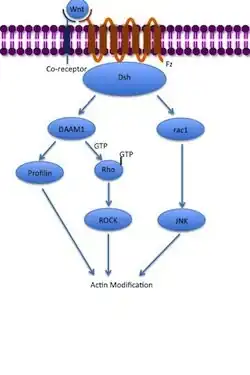 Nekanonická dráha planární buněčné polarity (PCP) nezahrnuje β-katenin. Nevyužívá koreceptor LRP5/6, leč se předpokládá zapojení NRH1, Ryk, PTK7 nebo ROR2. Dráha PCP se aktivuje navázáním proteinu Wnt na Fzd a koreceptor. Receptor Fzd pak zapojí protein Dsh, kterého domény PDZ a DIX vytvoří komplex s dishevelled asociovaným aktivátorem morfogeneze 1 (Daam1). Daam1 poté prostřednictvím guaninového nukleotidového výměnného faktoru aktivuje malý G-protein Rho. Rho zase aktivuje Rho asociovanou kinázu (ROCK), která je jeden z hlavních regulátorů cytoskeletu. Dsh také vytvoří komplex s proteinem Rac1 a zprostředkovává vazbu profilinu na aktin. Rac1 aktivuje JNK (c-Jun NH2 terminální kinázu) a může vyvolat polymerizaci aktinu. Navázaní profilinu na aktin může vést k přestavbě cytoskeletu a gastrulaci.[9][27]