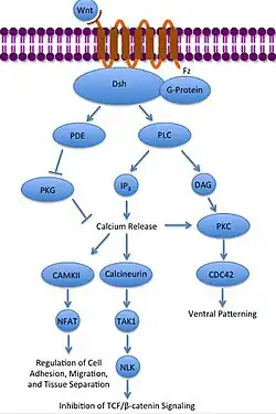 Nekanonická Wnt/vápníková dráha také nezahrnuje β-katenin. Její úkolem je napomáhat při regulaci uvolňování vápníku z endoplazmatického retikula (ER), a řídit tak nitrobuněčnou hladinu vápníku. Stejně jako při jiných Wnt dráhách se po navázaní ligandu Wnt aktivuje receptor Fzd, který přímo interaguje s Dsh a aktivuje specifické domény proteinu Dsh. Domény, které se zapájejí do Wnt/vápníkové dráhy, jsou PDZ a DEP.[9] Avšak na rozdíl od jiných Wnt drah, receptor Fzd tentokrát interaguje přímo s trimerickým G-proteinem. Tato současná stimulace Dsh a G-proteinu může vést k aktivaci buď fosfolipázy C (PLC), nebo cGMP specifické fosfodiesterasy (PDE). Jestli je aktivována PLC, membránový komponent PIP2 se rozdělí na DAG a IP3. Když se IP3 naváže na receptor na membráně ER, dojde k uvolnění vápníku.[28] Zvýšená koncentrace vápníku a DAG mohou prostřednictvím PKC aktivovat Cdc42, což je důležitý regulátor ventrálního uspořádání. Zvýšená hladina vápníku může také vést k aktivaci kalcineurinu a CaMKII. Protein kináza CaMKII je odpovědná za aktivaci transkripčního faktoru NFAT, který reguluje buněčnou adhezi, migraci a rozdělení tkání.[9] Kalcineurin aktivuje kinázy TAK1 a NLK, které mohou zasahovat do TCF/β-kateninové signalizace v rámci kanonické Wnt dráhy.[29] Jestli je však enzym PDE aktivován, uvolnění vápníku z ER je inhibováno. PDE tento proces reguluje prostřednictvím inhibice proteinkinázy G (PKG), což následně způsobí inhibici uvolnění vápníku.[9]