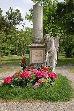 Pro nedostatek peněz bylo Mozartovo mrtvé tělo pohřbeno do „všeobecného jednoduchého hrobu“ (nikoliv do hromadného hrobu pro chudé), který se však nedochoval. Na vídeňském hřbitově Sankt Marx (Sankt Marxer Friedhof) v dnešním 3. městském okrese Landstraße (je součástí Vídně teprve od roku 1850), kde byl Mozart pohřben, byl však pro něho postaven památník.