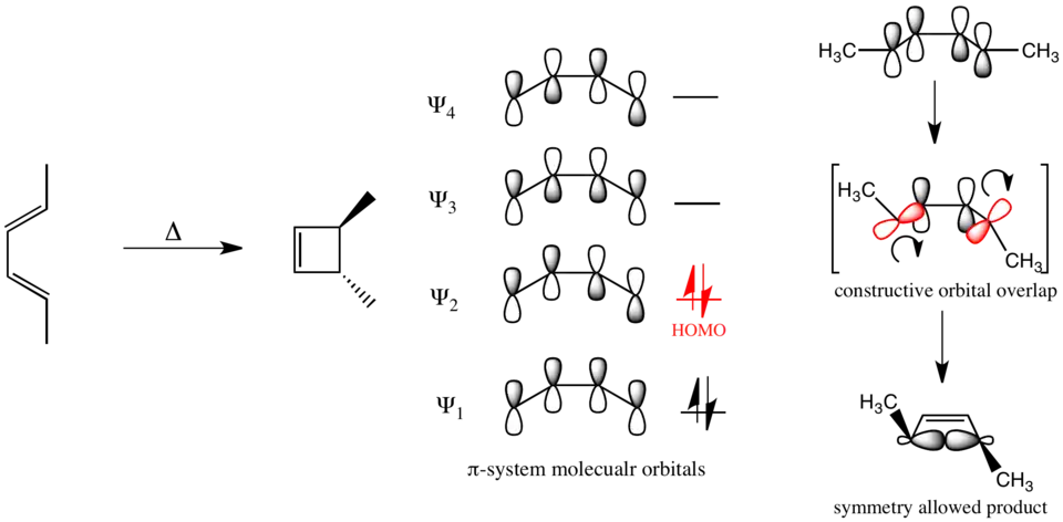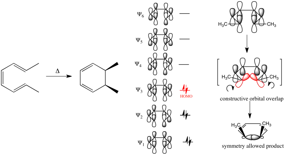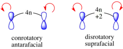 4n elektronová electrocyklická reakce vede k účinnému orbitalovému překryvu HOMO, pokud je konrotační, zatímco u 4n+2 electrocyklické reakce dojde k účinnému překryvu, pokud je proces disrotační.