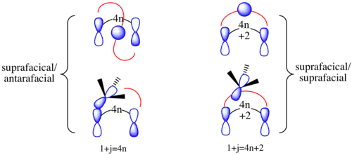 • Při supra/supra či antara/antara přesmyku platí, že pokud i + j = 4n + 2, tak je tepelně povolen a pokud i + j = 4n, tak je fotochemicky povolen.