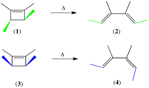 Woodwardova–Hoffmannova pravidla byla vytvořena roku 1965 za účelem vysvětlení stereospecifity elektrocyklických reakcí řízených teplem nebo fotochemicky. Stereochemie elektrocyklizace byla synteticky významná vzhledem k Woodwardově dlouhodobé snaze o totální syntézu vitaminu B12, pozorování učiněná během pokusů o syntézu vedla k formulaci Woodwardových–Hoffmannových pravidel. Uvedený model přeměny derivátů cyklobutenu a butadienu je pouze ilustrativní.[3] Termolýza trans-1,2,3,4-tetramethyl-1-cyklobutenu (1) umožňuje vznik pouze jednoho geometrického izomeru, (E,E)-3,4-dimethyl-2,4-hexadienu (2), (Z,Z) a (E,Z) izomery nebyly ve směsi produktů nalezeny. Obdobně při termolýze cis-1,2,3,4-tetramethyl-1-cyklobutenu (3) vznikal pouze (E,Z) izomer (4).[4] U obou reakcí uhlíkové atomy na koncích zanikajících vazeb σ rotují ve stejném směru.[5]