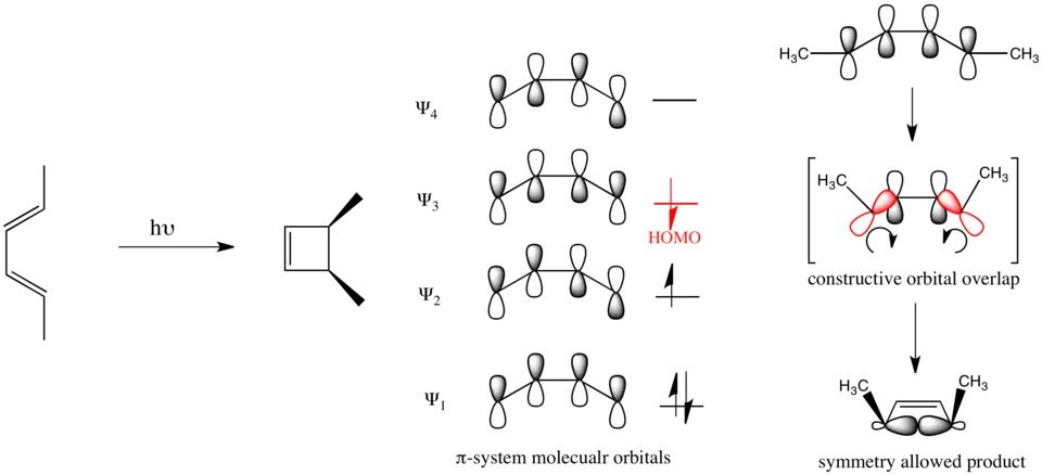 Při fotochemicky řízeném elektrocyklickém uzavírání kruhu buta-1,3-dienu způsobí vybuzení elektronu přeměnu na HOMO a reakce musí probíhat disrotatorně.