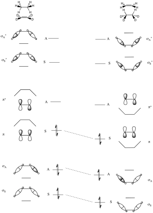 Molekulové orbitaly systému jsou symetrickými a antisymetrickými kombinacemi σ a σ* vazeb C–H v ethanu a π a π* vazeb deuterosubstituovaného ethenu. Molekulový orbital s nejnižší energií je tak symetrickým součtem dvou σ vazeb C–H, po něm následuje antisymetrický součet (σA). Dvojici orbitalů s nejvyšší energií jsou vytvářeny lineárními kombinacemi σCH protivazebných orbitalů – největší energii má antisymetrický σ*A, za ním následuje symetrický σ*A. Uprostřed se nachází zbývající dva molekulové orbitaly πCC a π*CC ethenu.