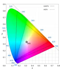 - ↑ a b c d e f BT.2020 : Parameter values for ultra-high definition television systems for production and international programme exchange. www.itu.int. Mezinárodní telekomunikační unie, June 2014. Dostupné online [cit. 2014-09-08].