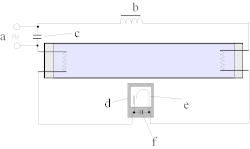 a – vstup, b – tlumivka, c – kompenzační kondenzátor, d – startér, e – bimetalová elektroda, f – odrušovací kondenzátor