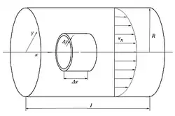 Na povrchu trubice (y = R) bude rychlost částic nulová a do středu se bude zvyšovat. V ose trubice bude rychlost největší. Vrstvy částic se budou po sobě třít (laminární proudění). Síla uvádějící tekutinu do pohybu vztažená na jednotku povrchu vrstvy v hloubce y a v místě x trubice τxy je dána součinem činitele dynamické viskozity η a změny rychlosti v místě x vx podél souřadnice y:
