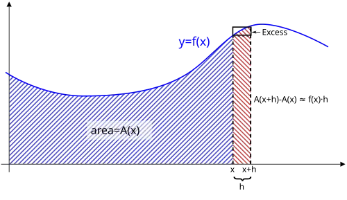 A(x + h) − A(x) je tedy přibližně rovno ƒ(x)·h. Jinak řečeno, ƒ(x)·h ≈ A(x + h) − A(x), přičemž jak se h limitně blíží k nule, stává se z přibližné rovnosti rovnost.
