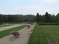 Zahrada navazuje na podélnou osu zámecké stavby, která na východě pokračuje v podobě vodního kanálu vytékajícího z obory protilehlé zámku a větví se na dvě ramena obtékající pravoúhlý parter s barokní nádrží uprostřed, čímž soustava v půdorysu vytváří motiv trojzubce (tzv. Neptunovo žezlo). Na jižní část parteru navazuje růžová zahrada s kruhovým pavilonem hvězdárny, před nímž je pomník z roku 1959 od Jana Habarty, připomínající hudebního skladatele 18. století Františka Xavera Richtera působícího v místní zámecké kapele. Na východní část parteru navazují ovocné zahrady uzavřené zámeckou oborou pro daňky s alejí v hlavní ose parku.