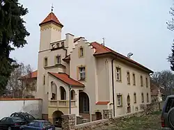 Zámek v Lochkově v Praze je dvoukřídlá budova s věžičkou.