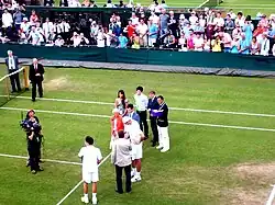 Po skončení zápasu převzali oba tenisté spolu s hlavním rozhodčím speciální dary (broušenou mísu a flétny na šampaňské),[9] od významných hostů turnaje, bývalého nejlepšího britského tenisty Tima Henmana a wimbledonské vítězky z roku 1969 Ann Haydonové-Jonesové. Následovalo focení u výsledkové tabule kurtu se zobrazeným skóre.[10]